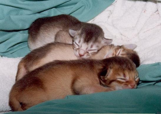 Notre première portée est née le 5 février 1999, des amours de Nougatine et de Nichrome des Fauve et Or (pedigree), somali silver fawn.