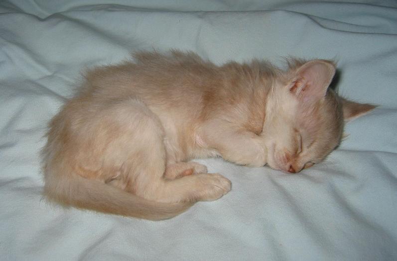 Rromynet et Mila avaient eu trois filles pour leur première portée (deux abyssines variantes, une somali). Ils nous firent une seconde portée en janvier 2002, avec la même répartition ! Les couleurs, de plus, furent les mêmes mais en non silver cette fois. Il est vrai qu'il y avait bien une quatrième petite chatte silver chocolat, Tartine (au chocolat), mais elle n'a pas survécu, ayant une malformation (atrésie du pylore).