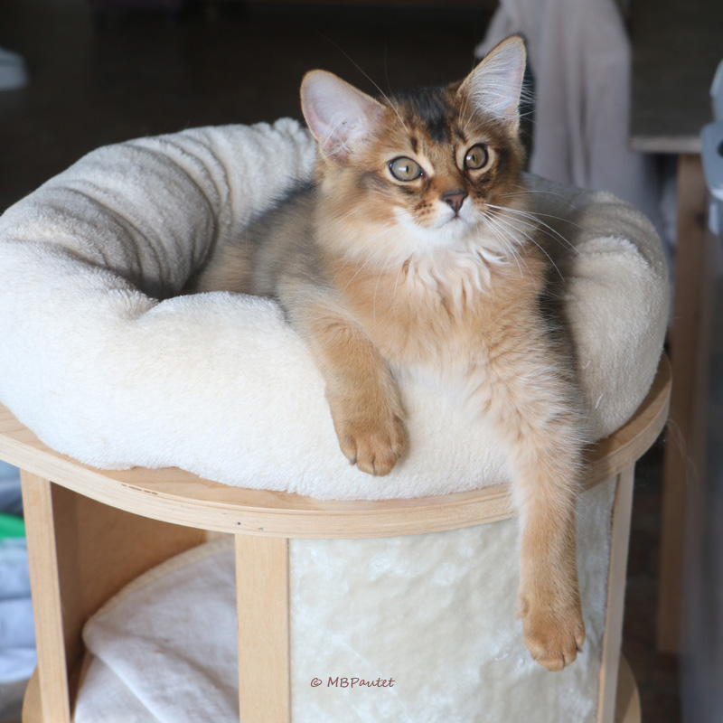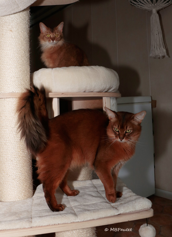 Les voilà tous deux sur l'arbre à chat (Pépite dans le coussin rond, Demis devant) :