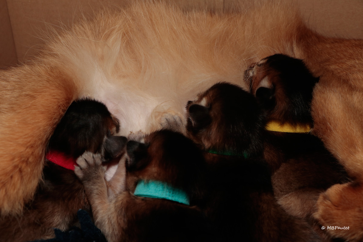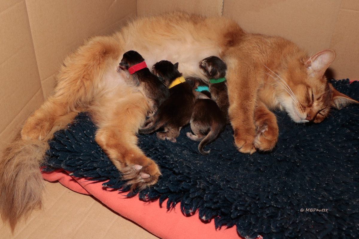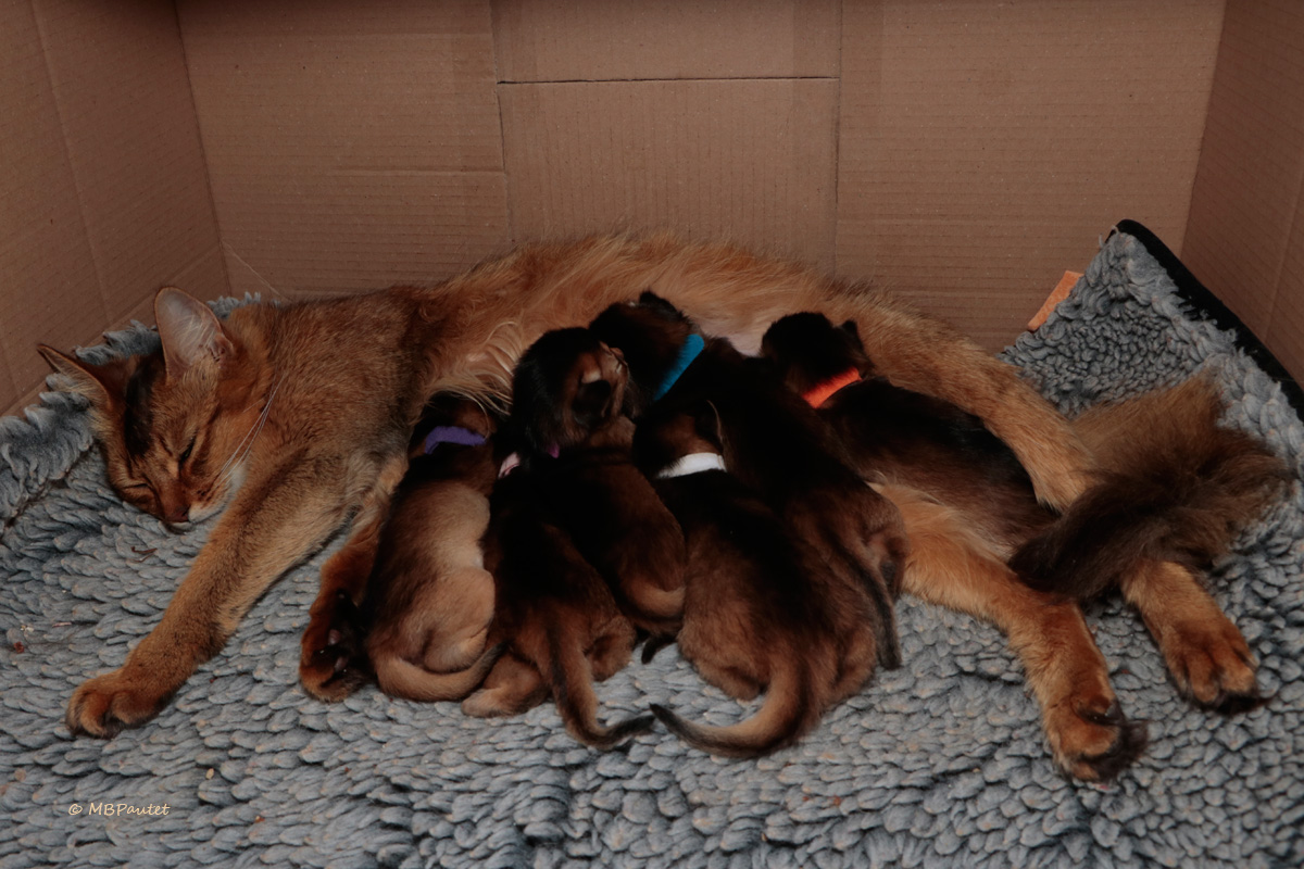 Epuisée, la maman essaie de se reposer un peu pendant que 5, puis 6 chatons cherchent (et trouvent) les tétines.