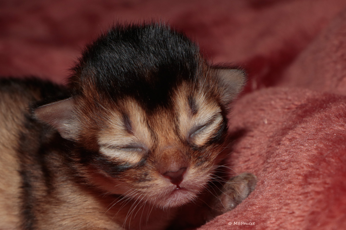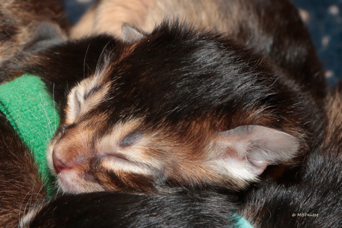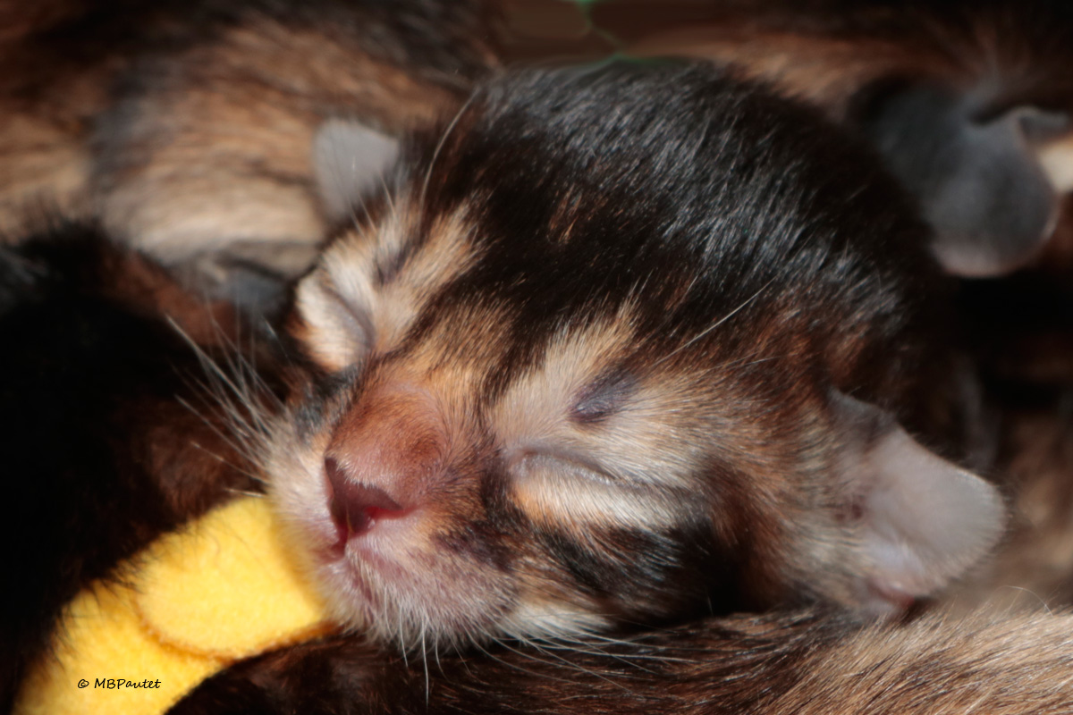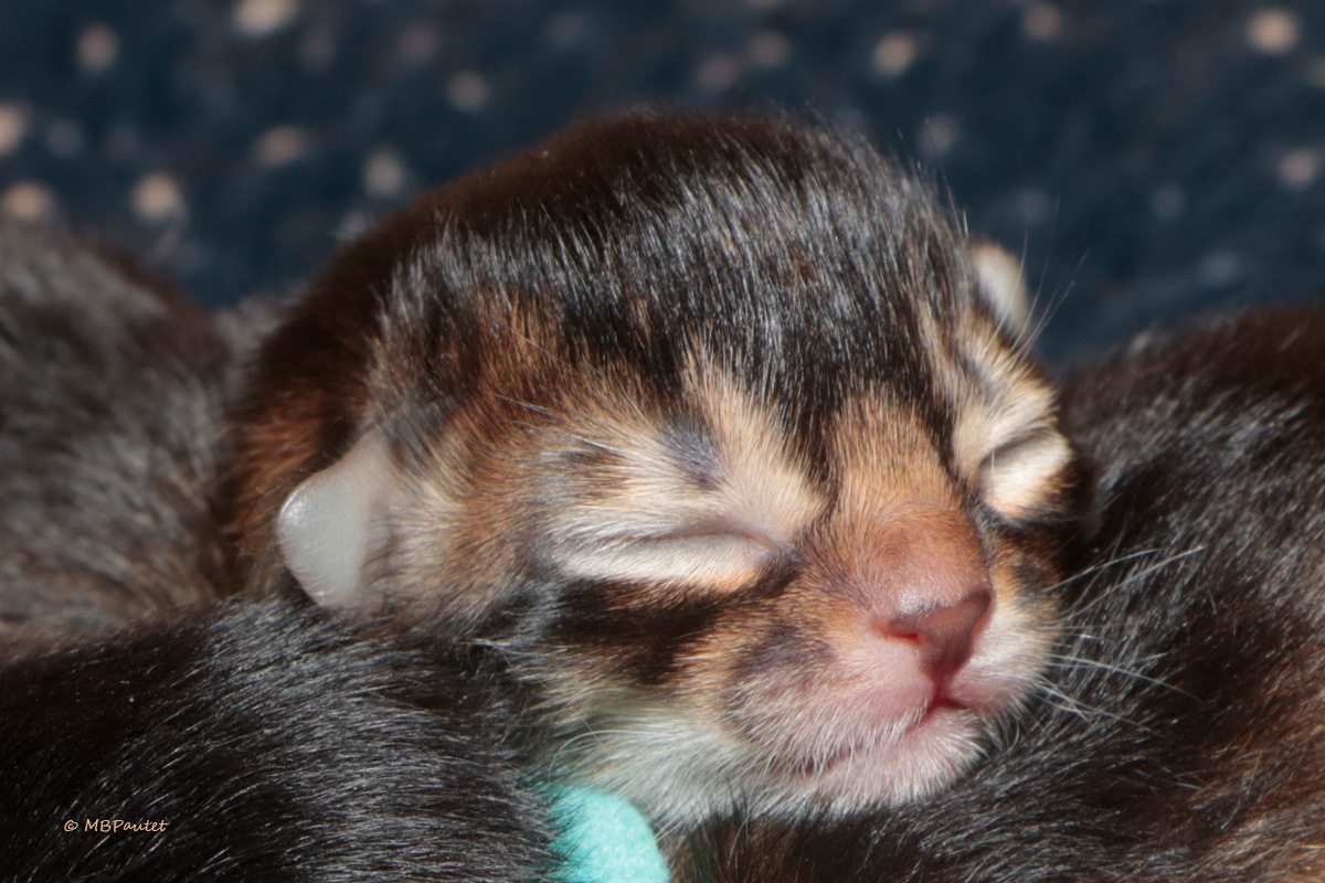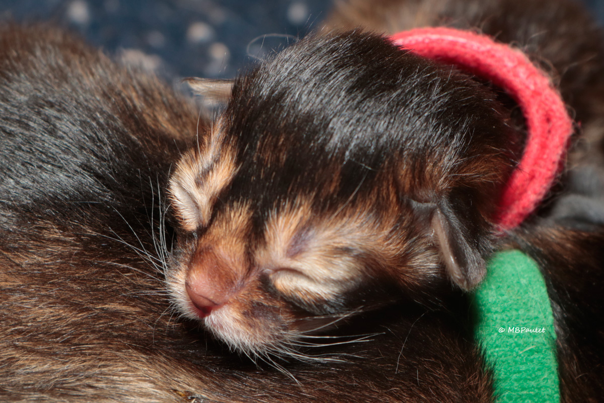 Les chatons grandissent bien, R'Maïnie est très attentionnée. Voici leurs portraits individuels à 5 jours :