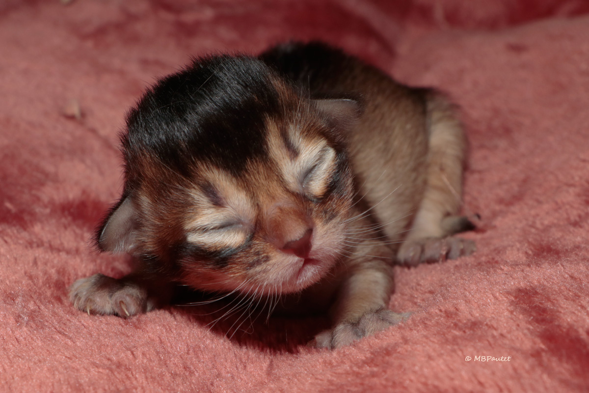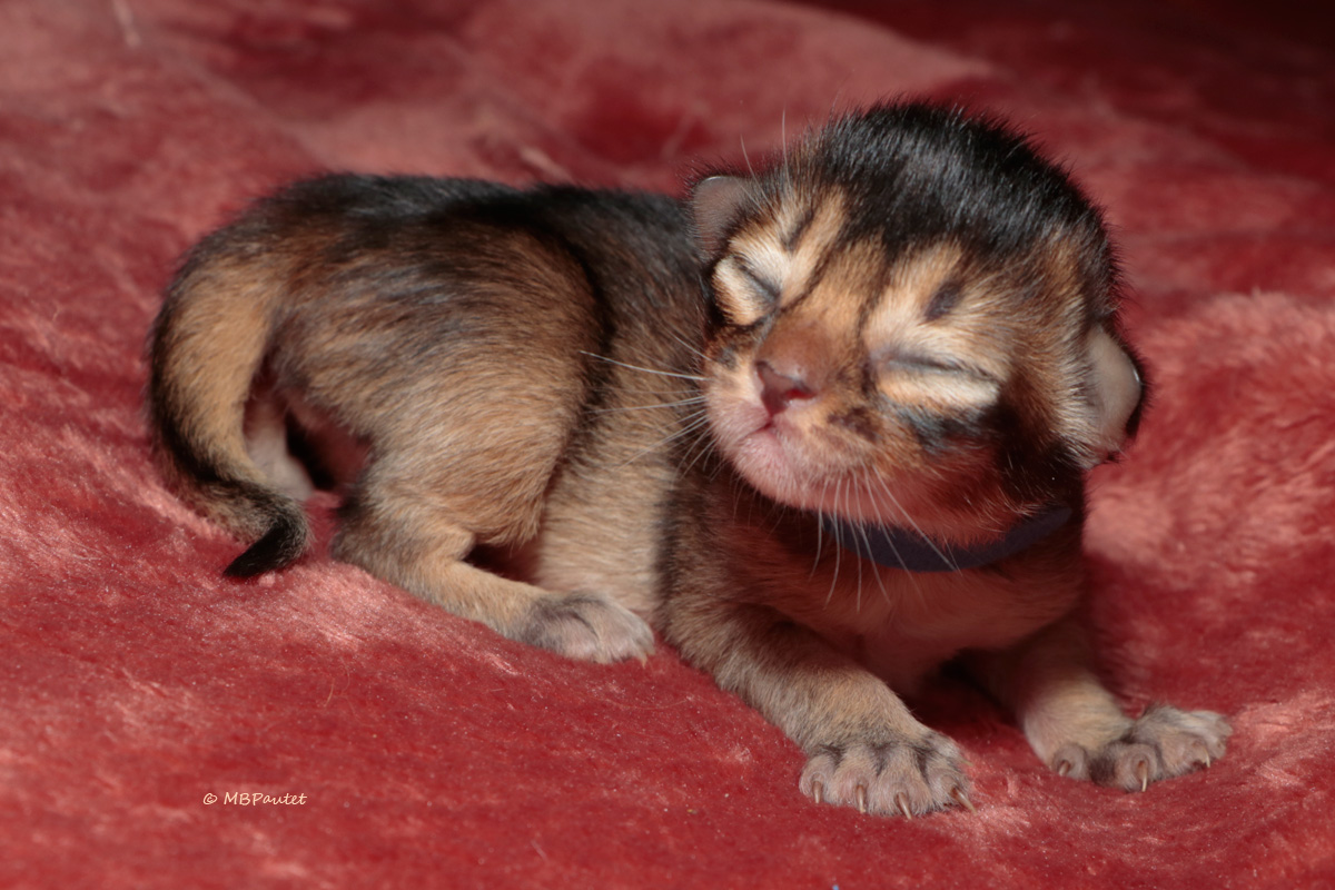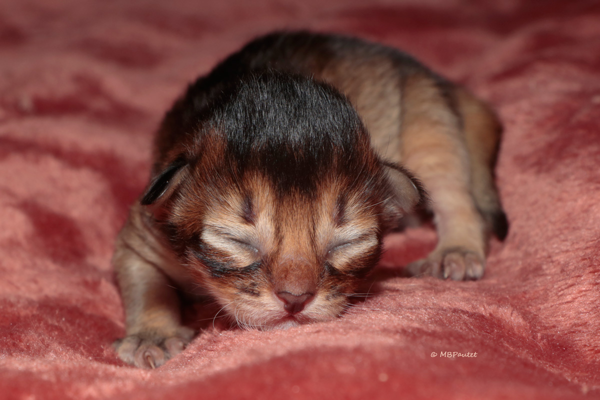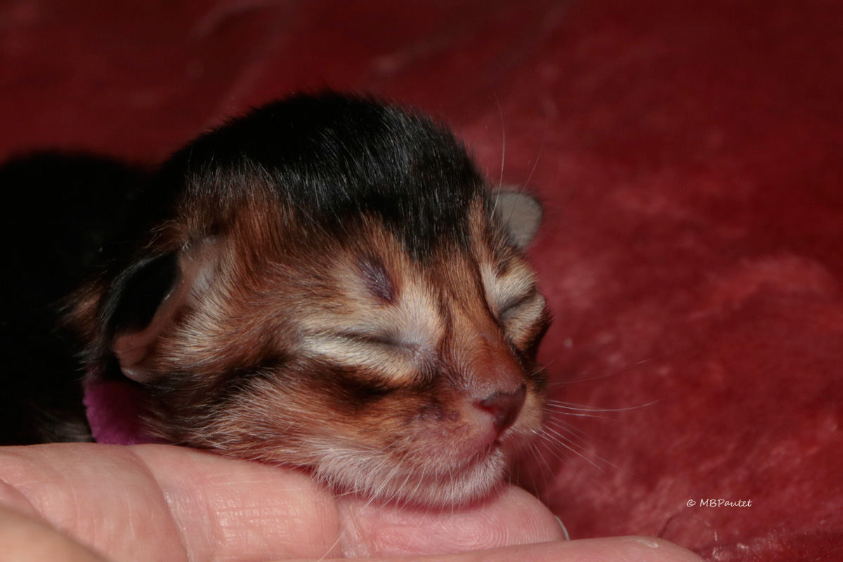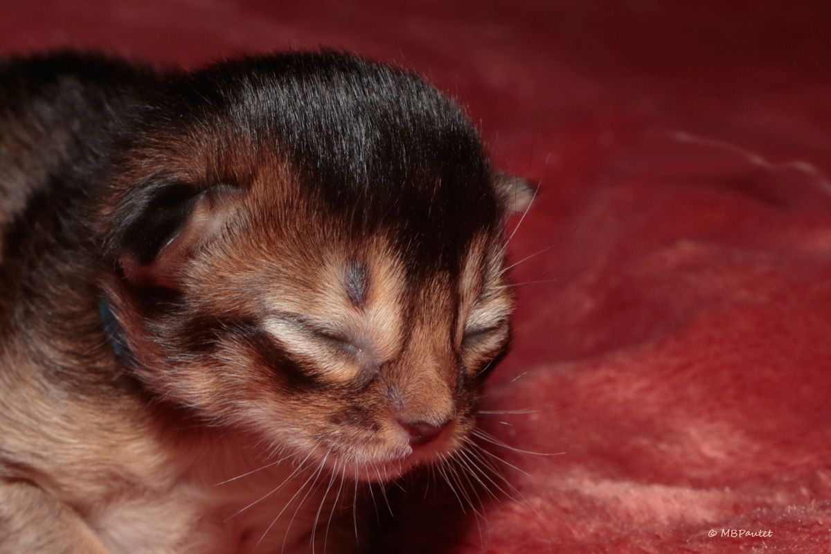 Les chatons grandissent bien, R'Maïnie est très attentionnée. Voici leurs portraits individuels à 5 jours :