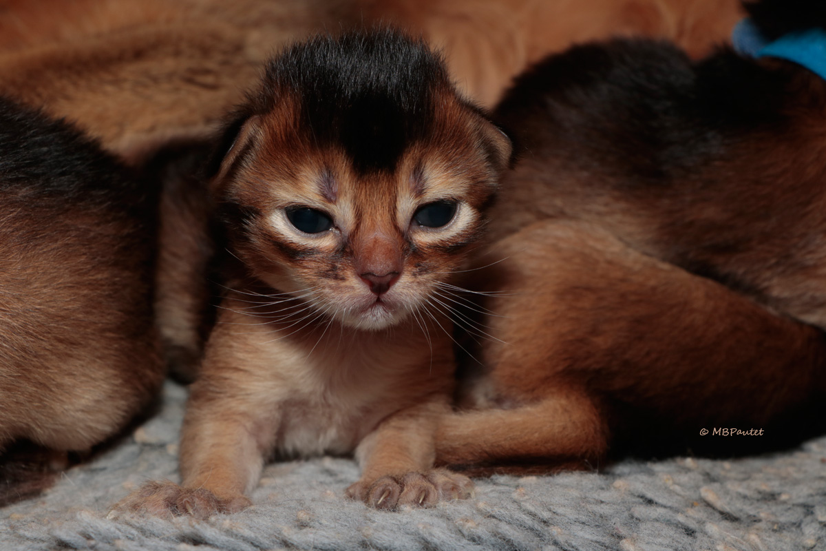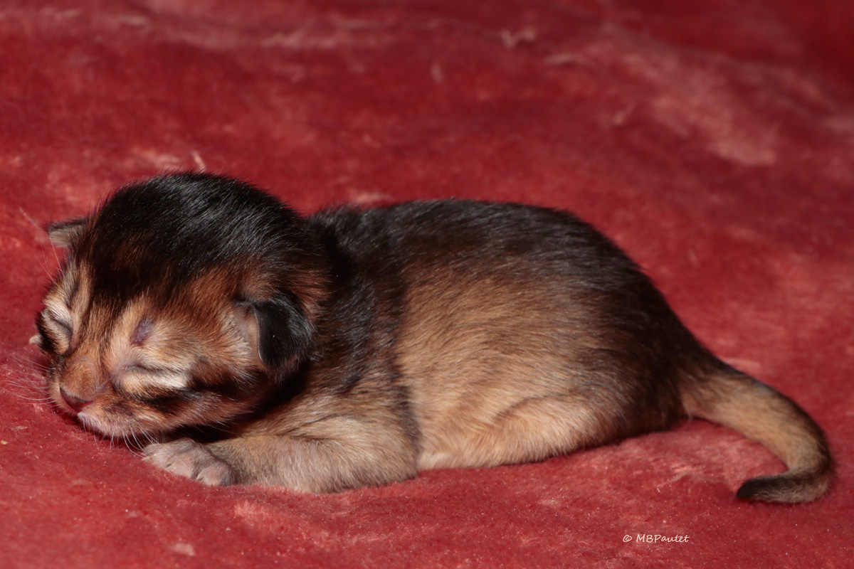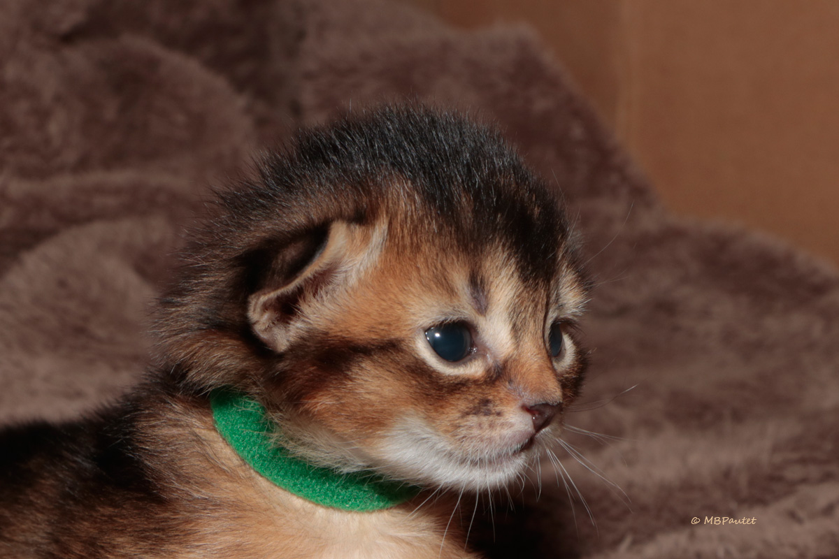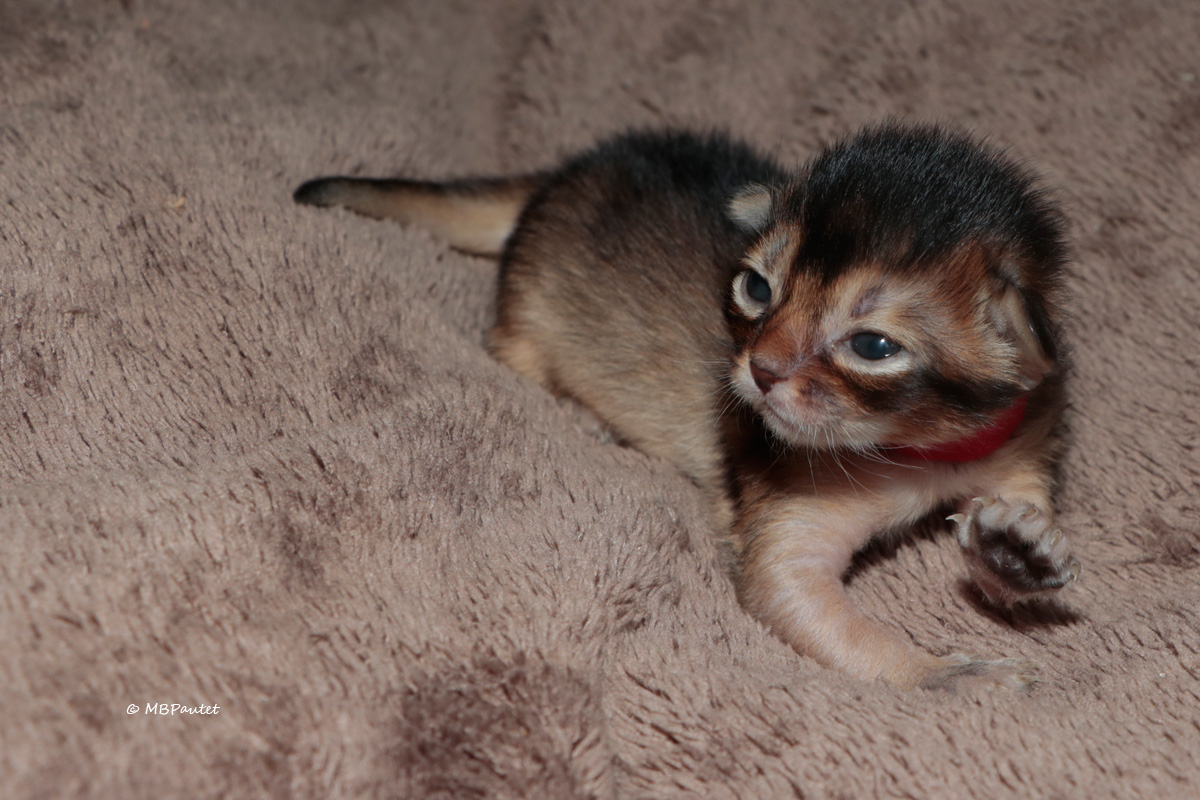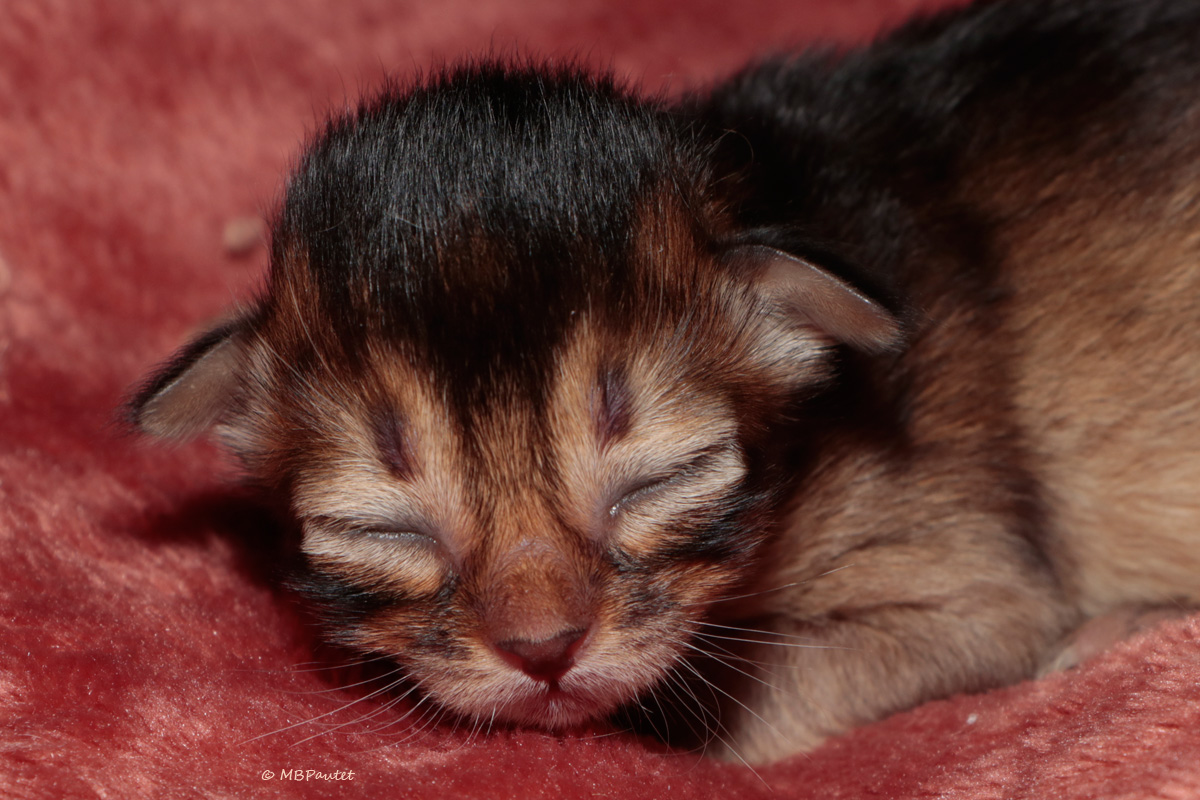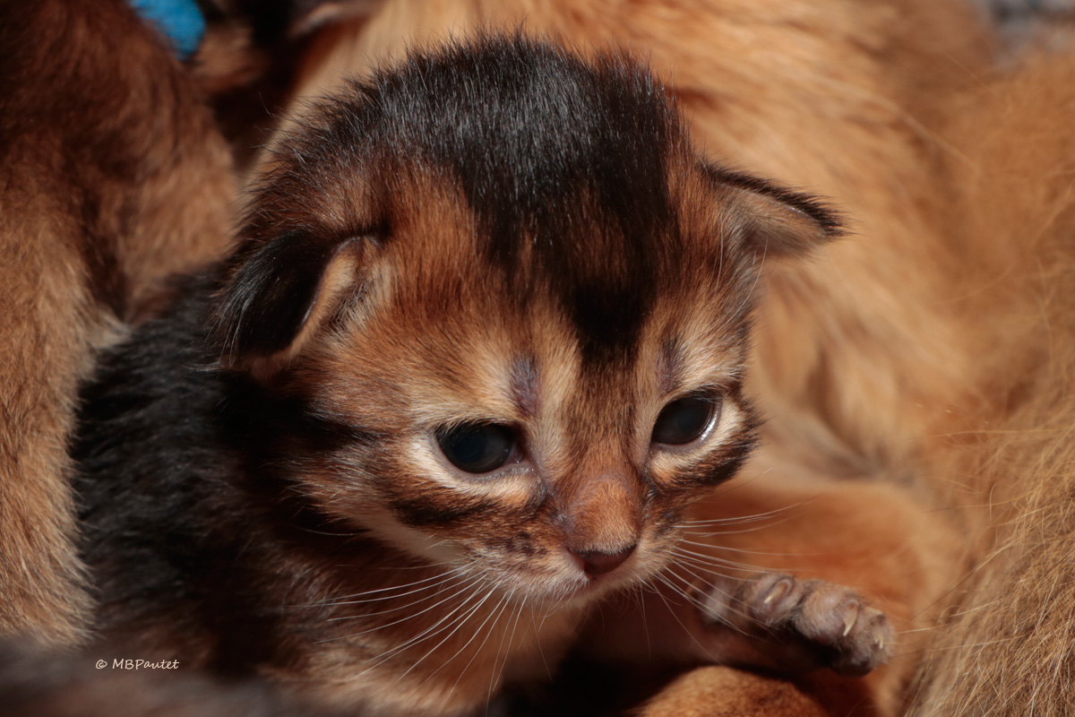 Les chatons grandissent bien, R'Maïnie est très attentionnée. Voici leurs portraits individuels à 5 jours :