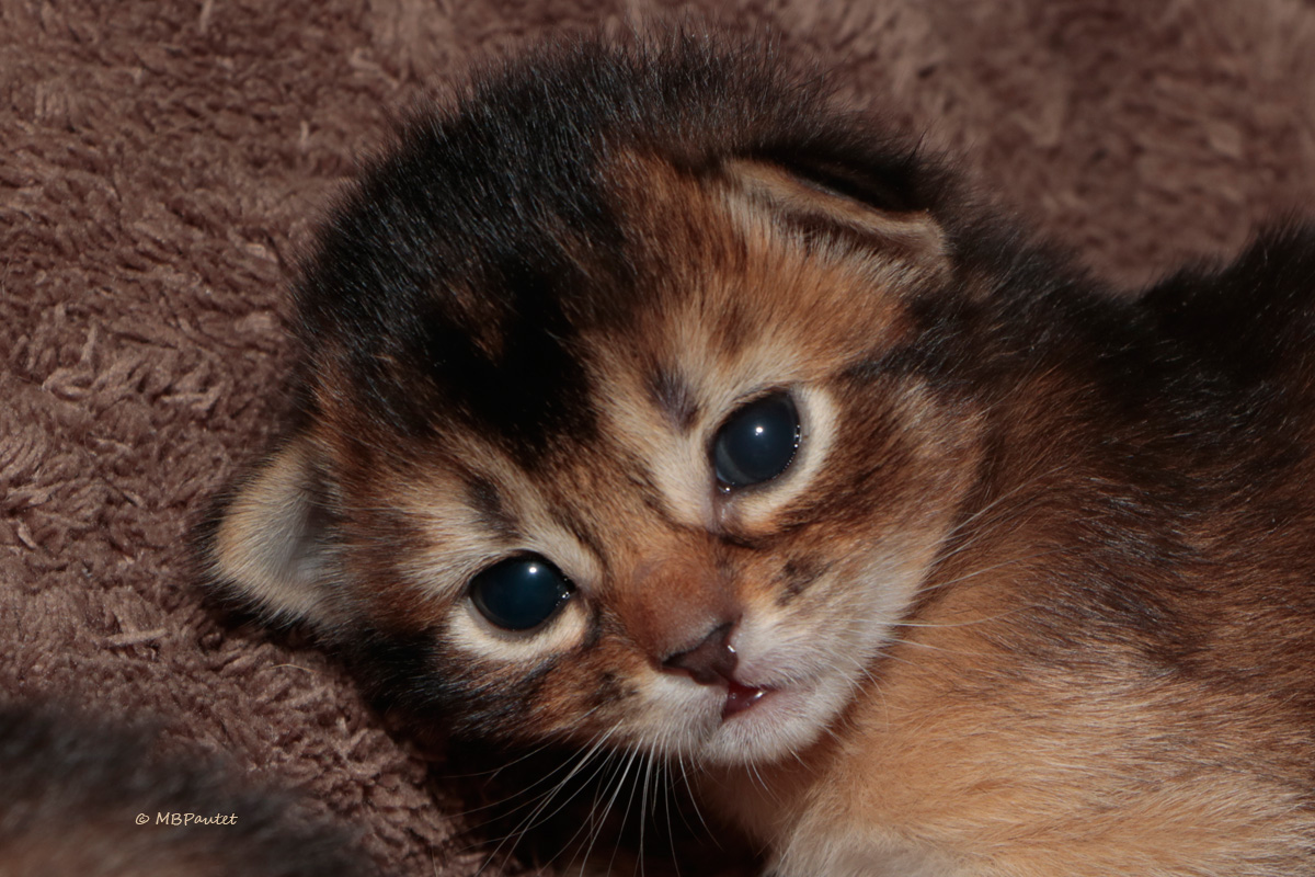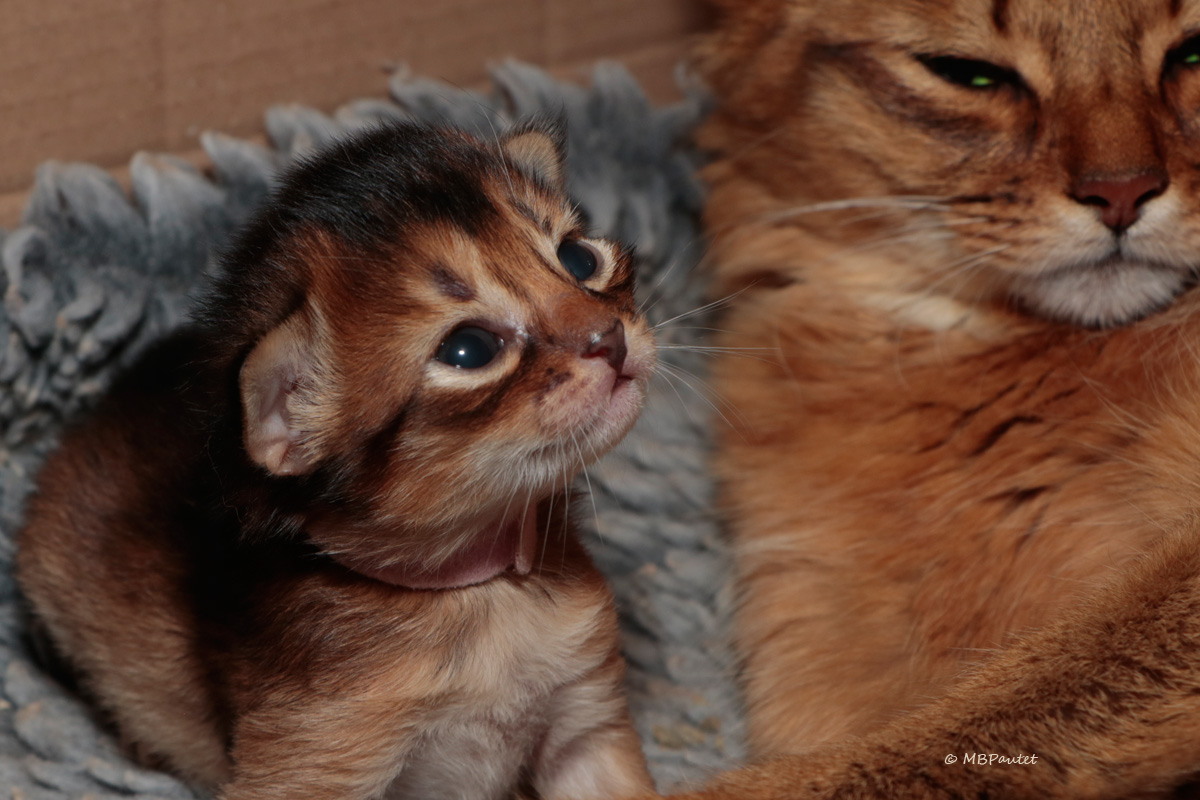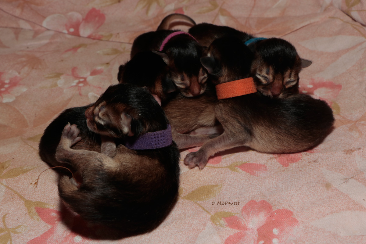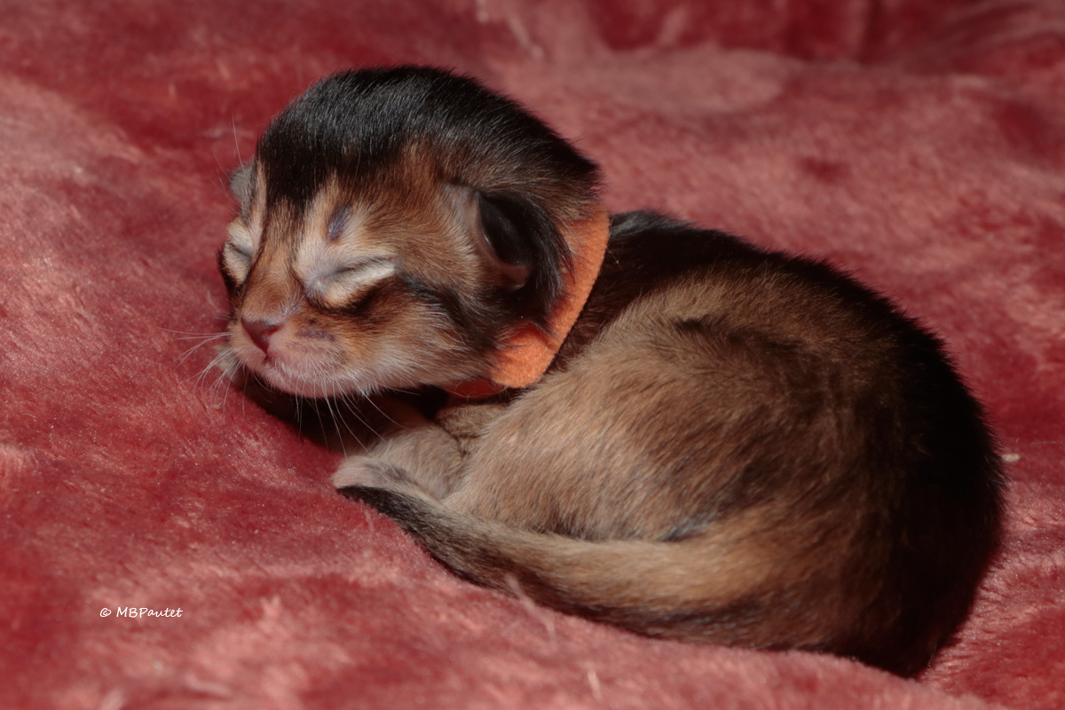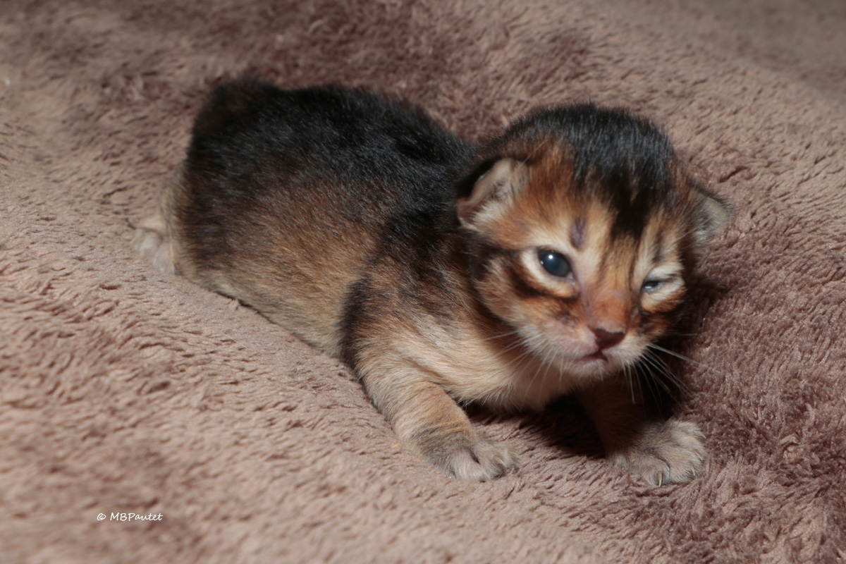 Les chatons grandissent bien, R'Maïnie est très attentionnée. Voici leurs portraits individuels à 5 jours :