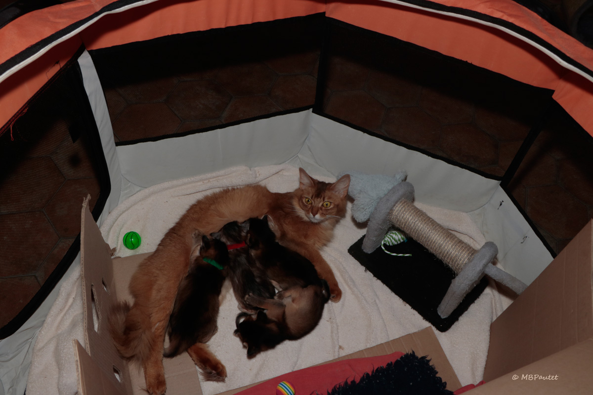 Pépite a encore trois mamelles actives (et très sollicitées, car les chatons ont attendu d'avoir presque 6 semaines