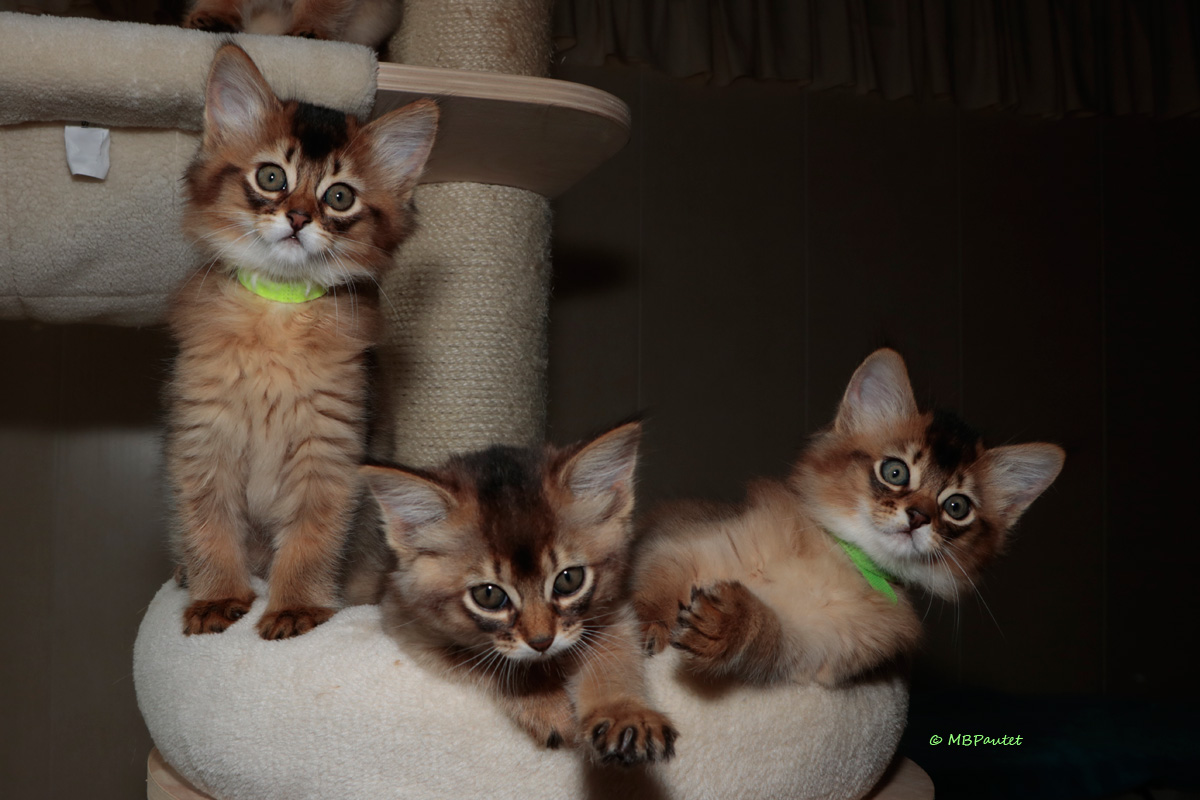 Voici la photo de la fratrie : de gauche à droite, PM2 (dont le collier est noir maintenant, faute de stock en bleu !),