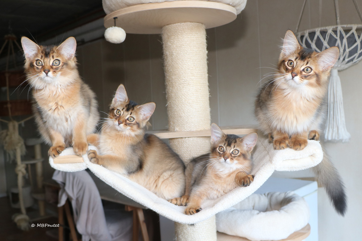 Voici les quatre chatons qui ont choisi de faire la sieste ensemble dans le hamac de l'arbre à chat :